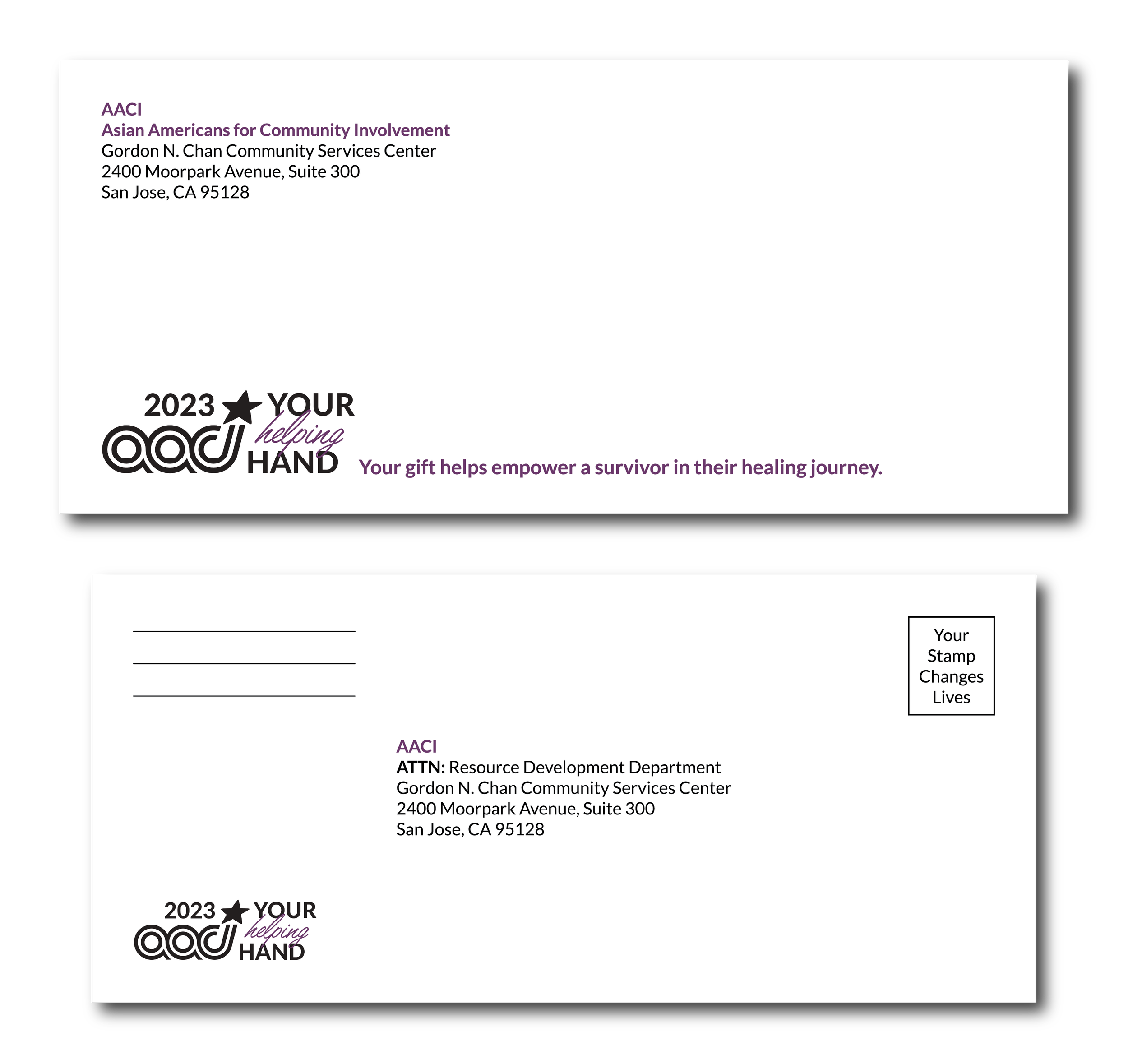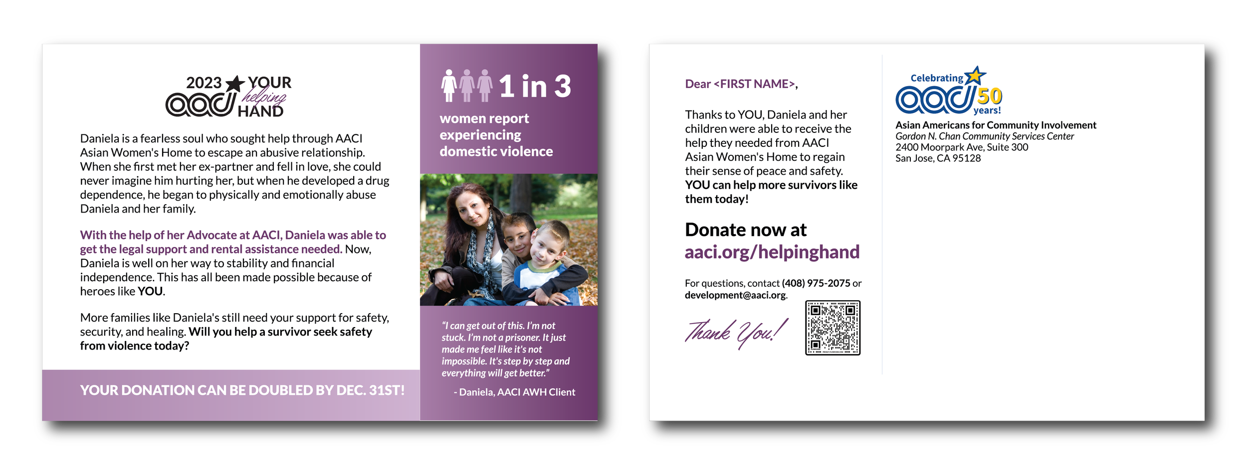 The Year End Appeal winter campaign consisted of two direct mailings with the goal of raising money to support clients from AACI’s Asian Women’s Home program. The first mail drop consisted of a 2-page letter, 1-page remittance, remittance envelope, and an outer envelope. The second mail drop consisted of a postcard with a shortened form of the 2-page letter.