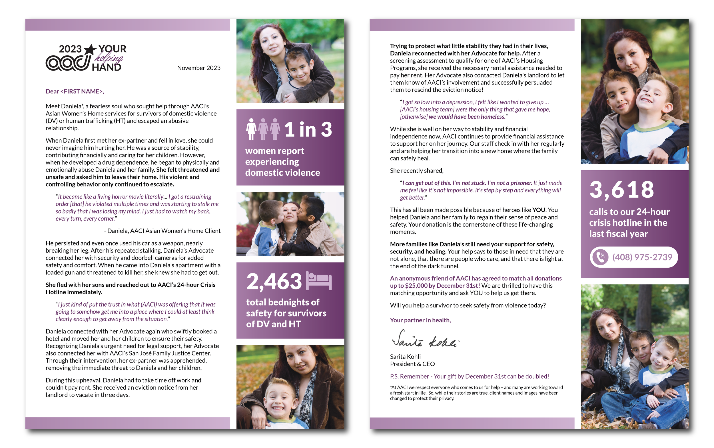 With the help of AACI’s generous donor base, AACI was able to raise $133,600 for our Your Helping Hand winter campaign. This donation allows AACI to remain as committed as ever to providing essential health and wellness services to our community's most vulnerable individuals and underserved families. As per this year’s campaign theme, these funds will help provide essential services for our survivors of domestic violence and human trafficking at AACI Asian Women's Home! It also ensures that many other AACI clients, like foster youth and children from low-income households, get the support they need!